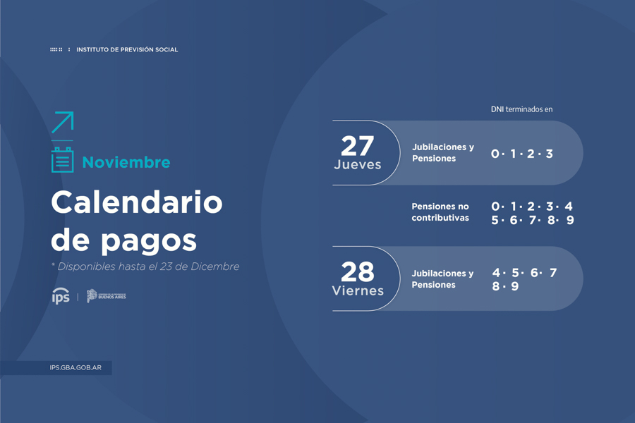 El Instituto de Previsión Social (IPS) informa que las personas jubiladas y pensionadas de la provincia de Buenos Aires percibirán los haberes del mes de noviembre a partir del día jueves 27 del corriente, según cronograma que se detalla a continuación:
